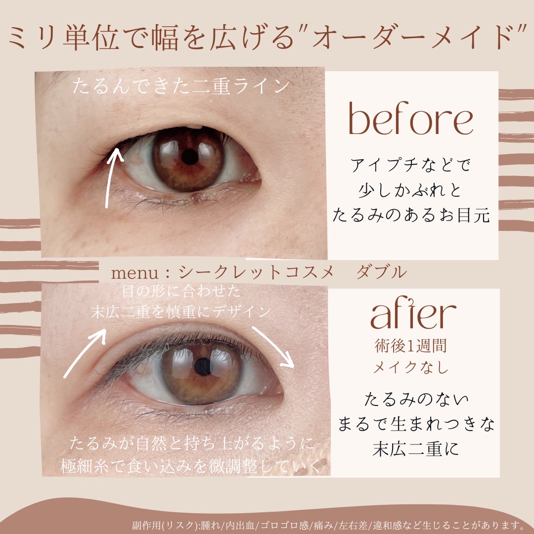 シークレットコスメ・ダブル ナチュラル二重 2026 1/05 医師梅木医師 メニュー名シークレットコスメ・ダブル 症例解説 料金通常価格258,000円 モニター価格208,000円 合併症・リスク腫れ/内出血/ゴロゴロ感/痛み/左右差/違和感など生じることがあります この施術の詳細ページはこちら