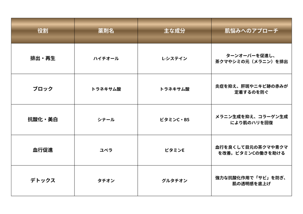 メラニンが作られるのを防ぐ(トラネキサム酸・シナール)だけでなく、できてしまったものを追い出す(ハイチオール)という、上流から下流までの同時ケアが可能になります。