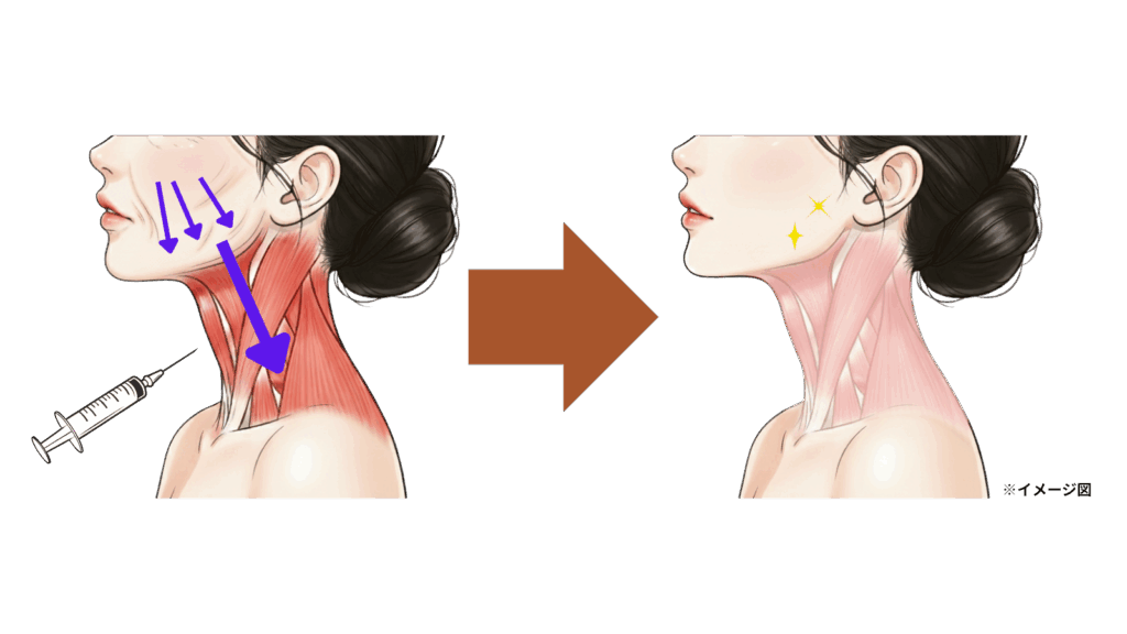 広頚筋という首の大きな筋肉にボトックスを注入することで、首の縦じわ改善やフェイスラインの引き締め効果が期待できるというもの。