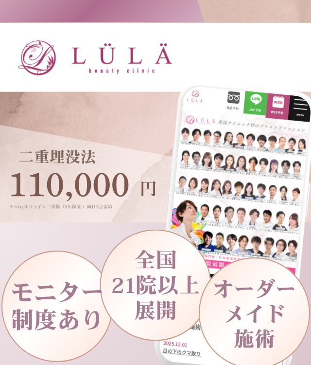 ![]() ルラ美容 クリニック | ・二重埋没法 ・二重切開法 | ・諸費用がすべて含まれた透明性の高い料金設定 ・モニター価格でお得に施術を受けられる |