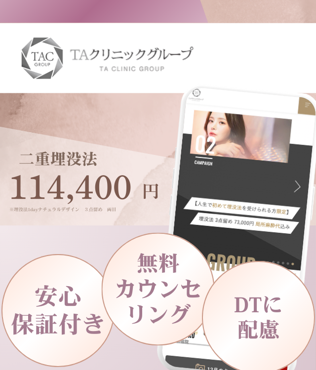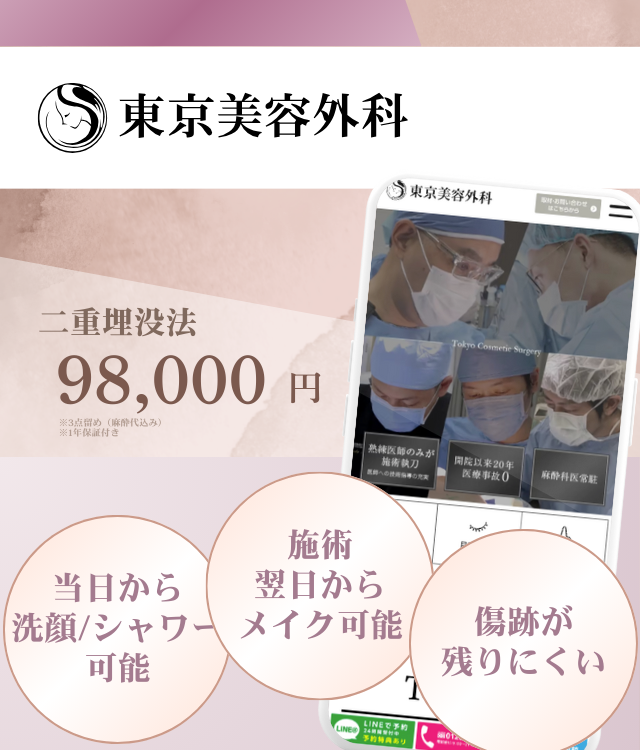 ![]() TCB東京中央 美容外科 | ・二重埋没法 ・二重切開法 | ・手厚い保証で術後も安心 ・痛みや腫れなどに配慮した施術を提供 |