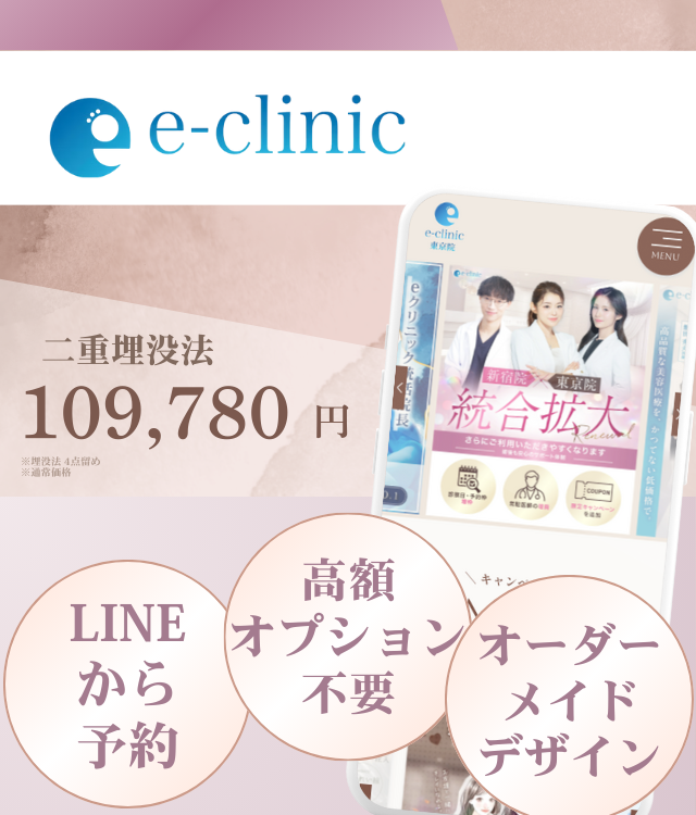 ![]() e-clinic | ・二重埋没法 ・二重切開法 | ・手軽で始めやすい料金設定 ・埋没法から切開法まで幅広いメニューをラインナップ |
