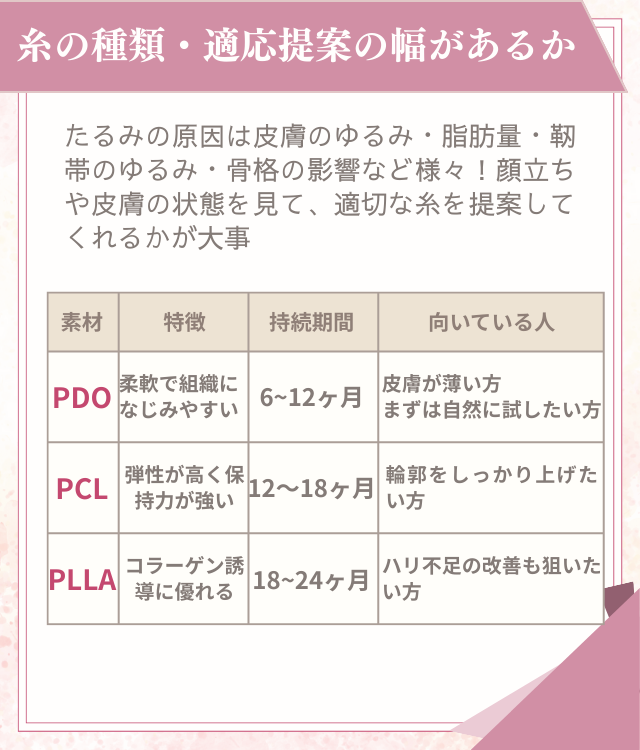 糸の材質によって、持続期間・引き上げ感・なじみやすさが変わります。まずは全体像をつかみ、年代や悩みに合う糸の種類を理解していきましょう。