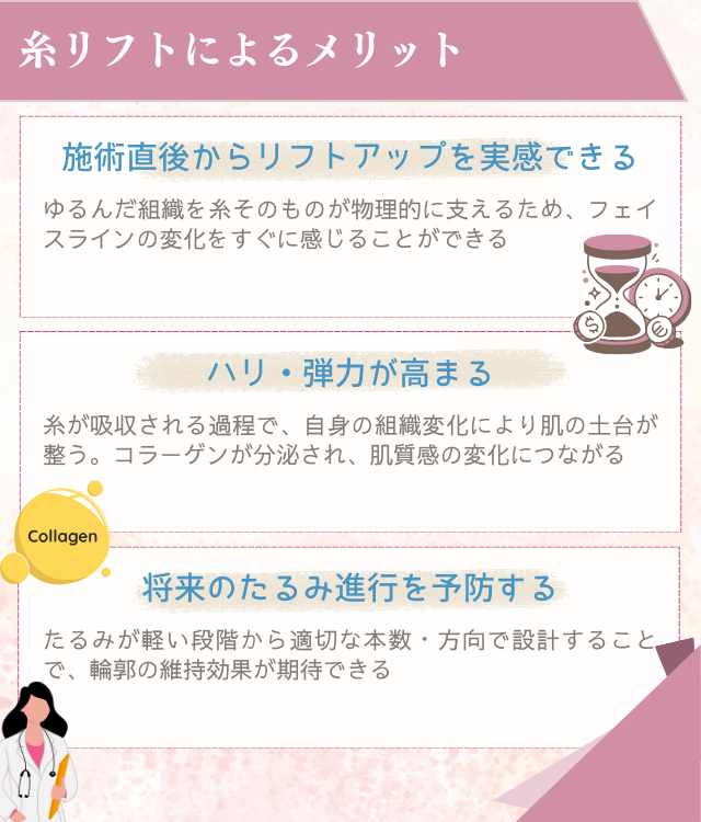 糸が体内で吸収される過程では、創傷治癒反応により周囲に線維組織が形成され、肌の土台が整うことでハリや弾力の向上を感じられる場合もあります。