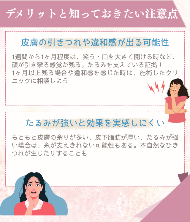 糸リフトの施術後1週間から1か月程度の期間は、笑う・大きく口を開けるなどの動作で引っ張られる感じや軽い痛み・ちくちく感が出ることがあります。