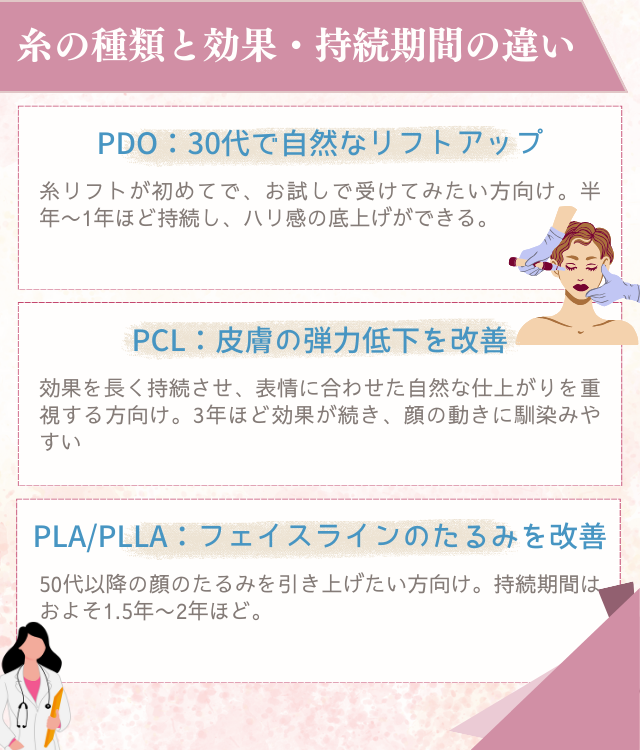 糸の材質によって、持続期間・引き上げ感・なじみやすさが変わります。まずは全体像をつかみ、年代や悩みに合う糸の種類を理解していきましょう。