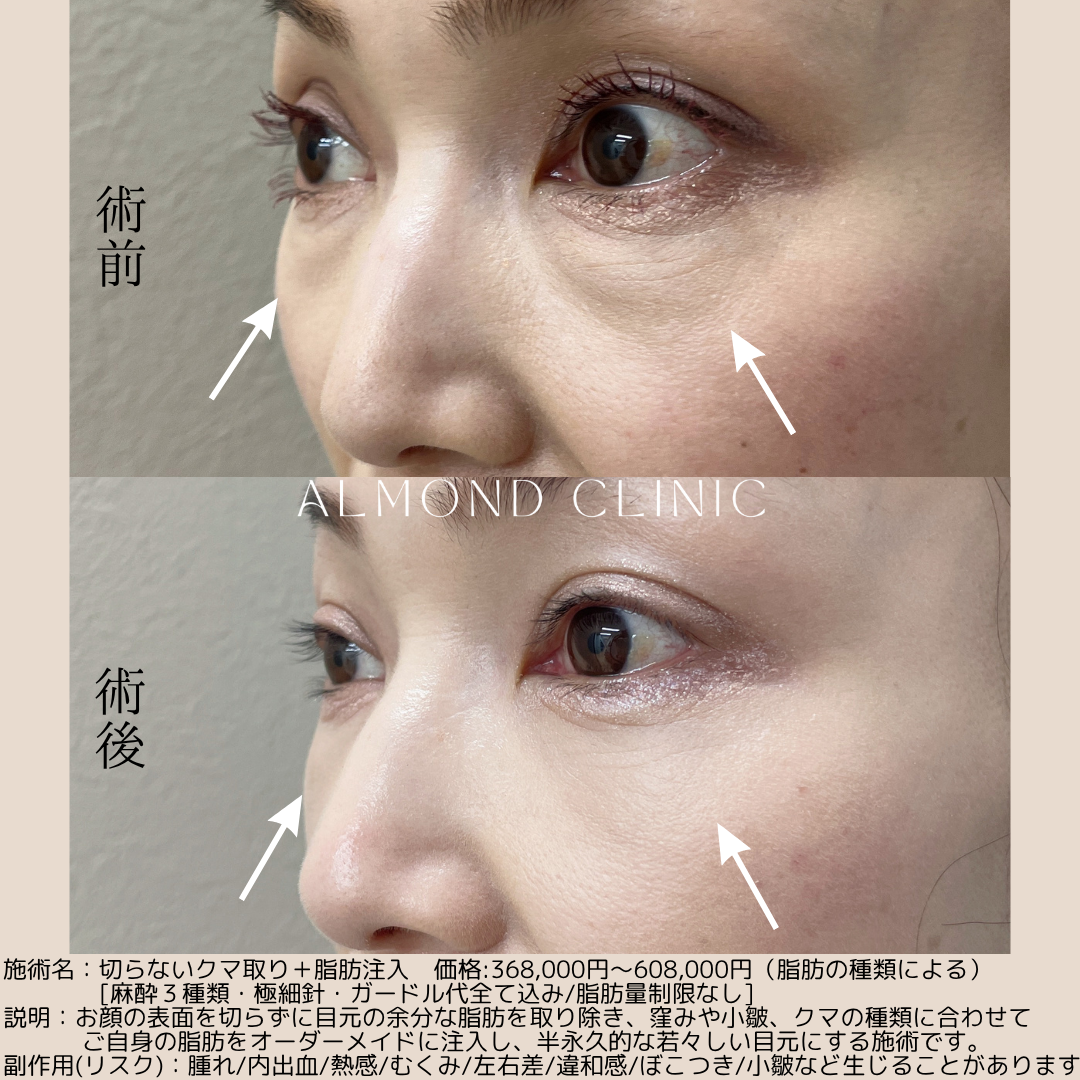 切らない目の下のクマたるみ取り 施術メニュー 梅木医師 2026 1/05 医師梅木健太 メニュー名切らない目の下のクマ取り+脂肪注入(CRF) 症例解説 料金368,000円(税込)~608,000円(税込) 合併症・リスク腫れ、内出血、熱感、むくみ、左右差、違和感、ぼこつき、小皺等 施術詳細はこちら 梅木医師のすべての症例をみる