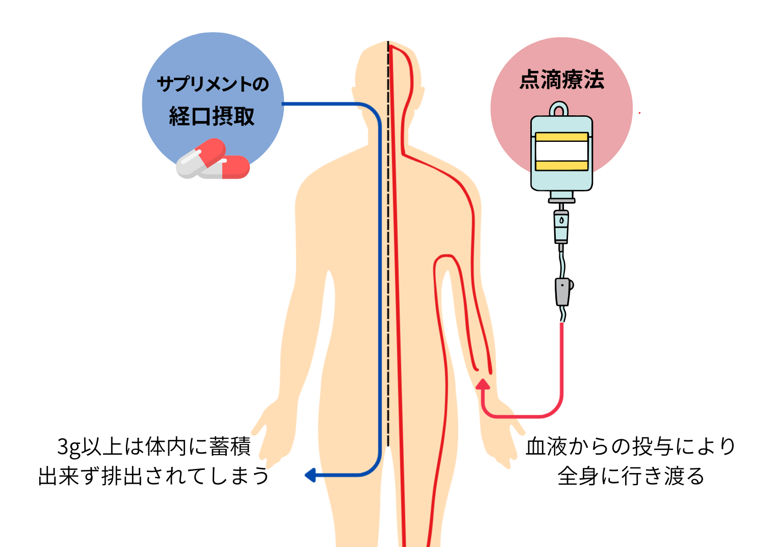 しかし、点滴はビタミンCを直接静脈内に投与するため、有効成分が全身の隅々の細胞まで行き渡り、経口摂取の約20~50倍という非常に高い血中濃度を実現します。